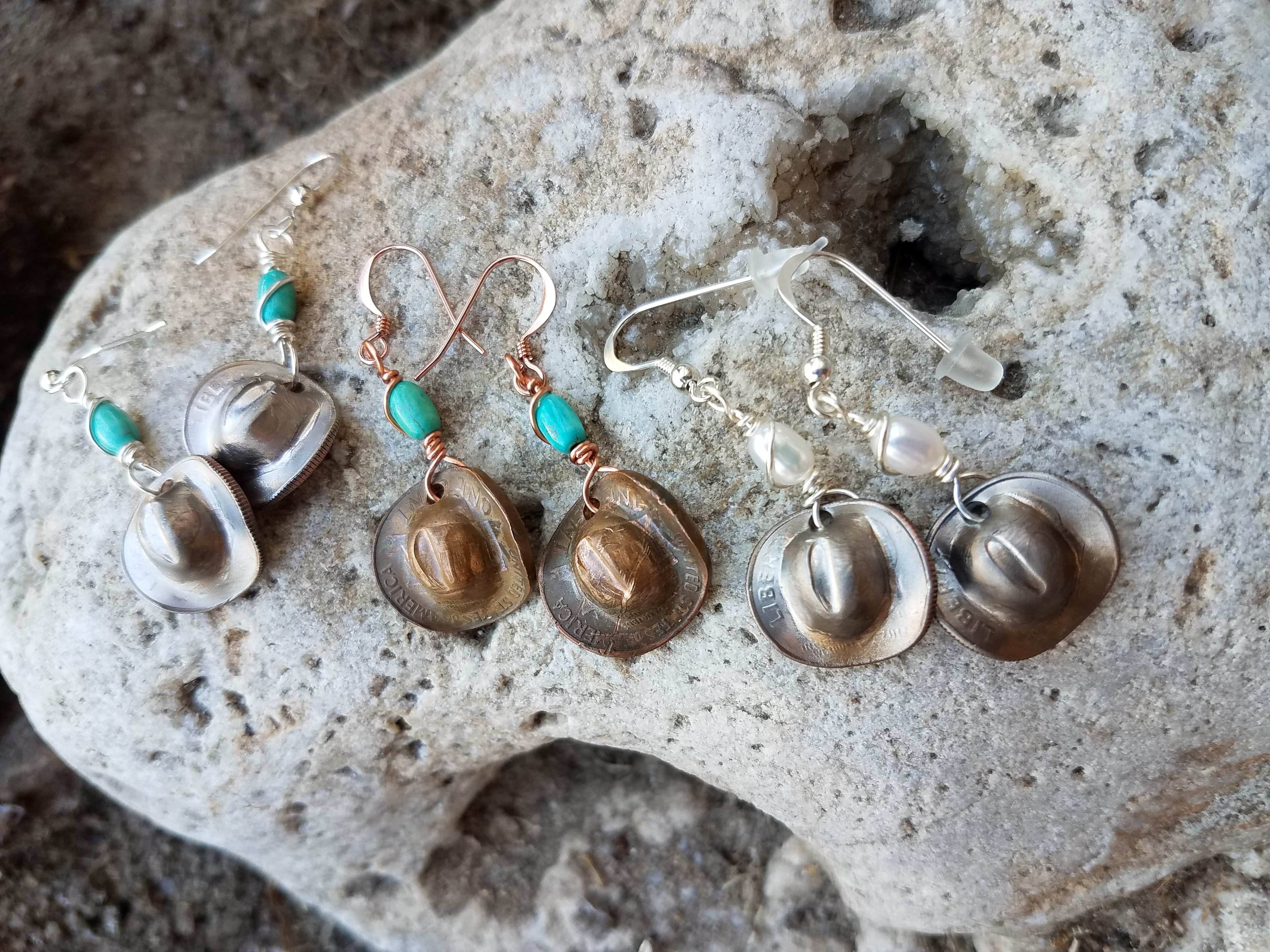 Posted in: Lyn D jewelry design. Tagged: cowboy hat, dimes, Earrings, fun, Lyn D jewelry design, Lynette Vandeveer, pearls, pennies, southwestern, turquoise.