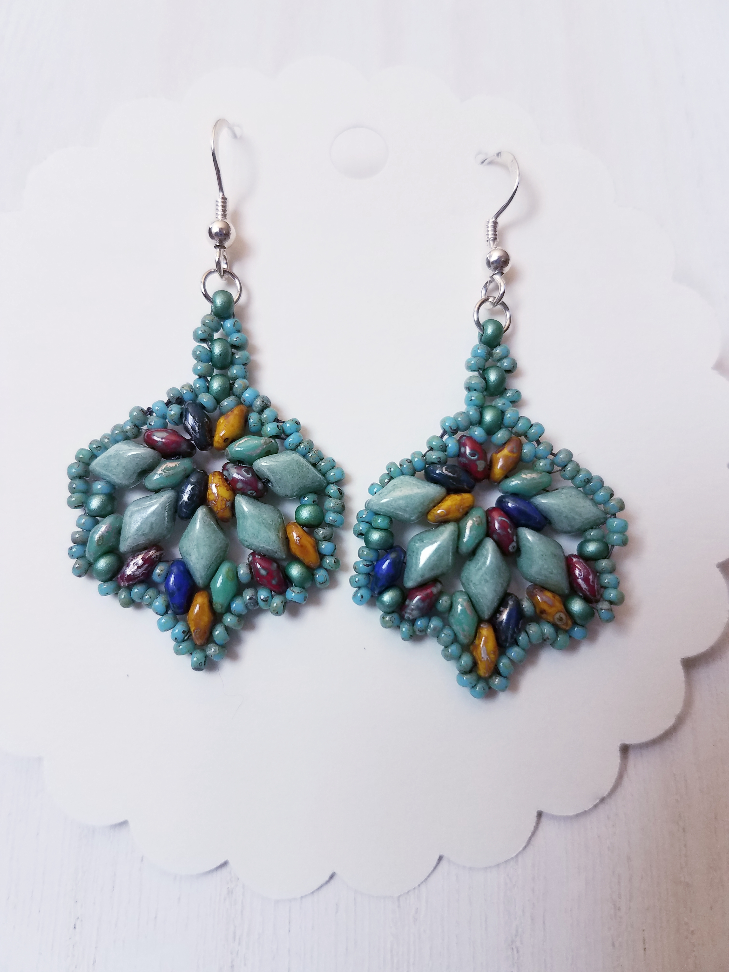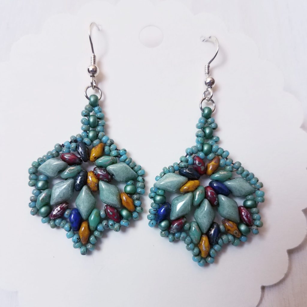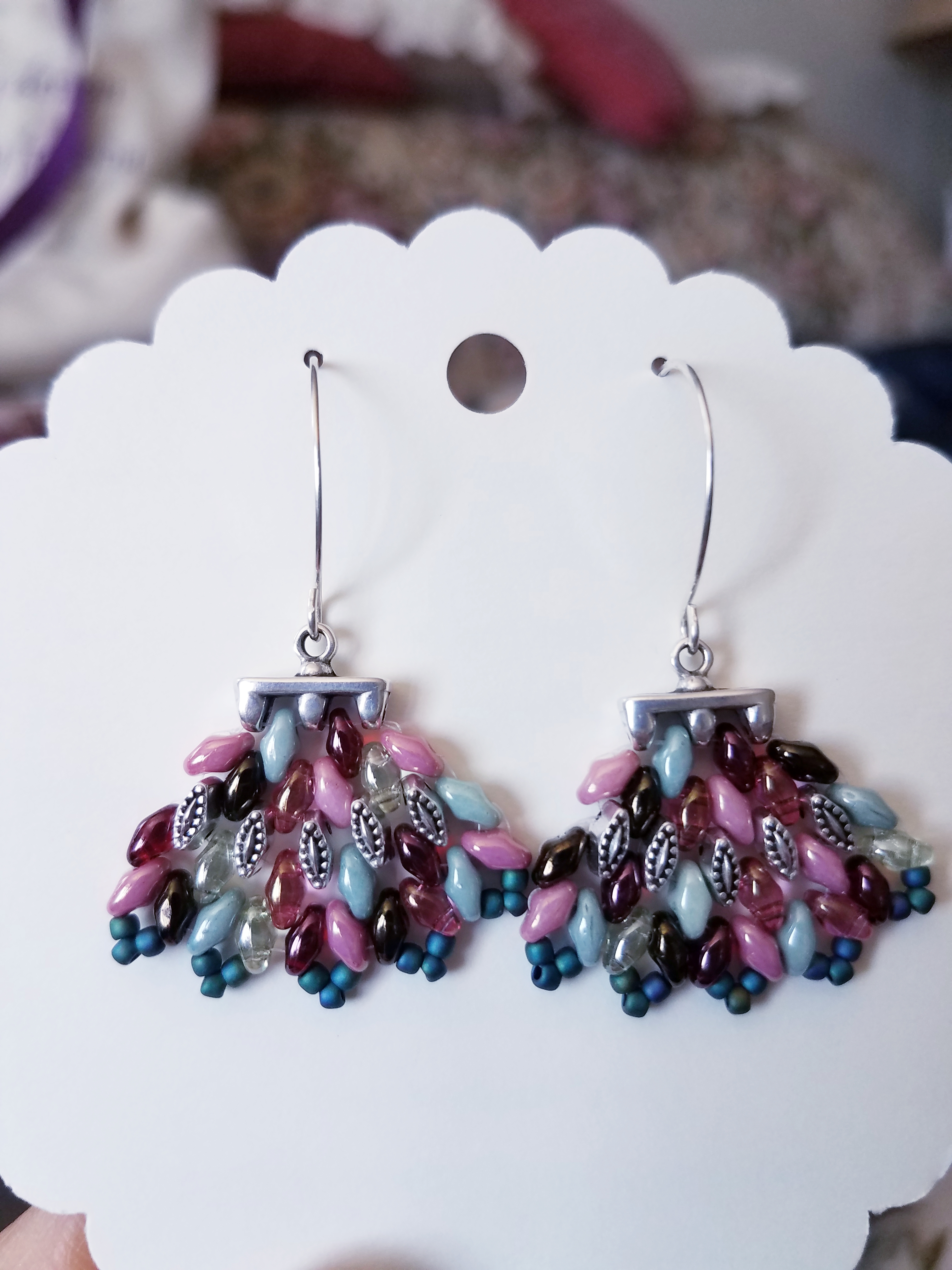 Pretty beaded earringsHand forged (by my cousin the blacksmith) penny and dime cowboy hat earrings. These are dated in pairs.Beautiful beaded earrings with the imagery of the ruins of Tulum.Pretty beaded leaf earrings.Same style, four different ways to have fun.