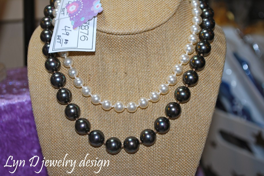 Bottom – Beautiful ‘Tahitian’ shell pearls, hand knotted with tan silk thread, back accents of warmly colored Swarovski crystals, matching earrings, gold filled findings.