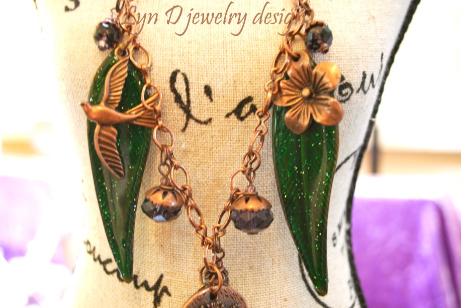 Earthy necklace set with sparkly green enamel on brass leaves, with bird, flower, and tree of life charms. Matching earrings with copper capped purple faceted crystals.